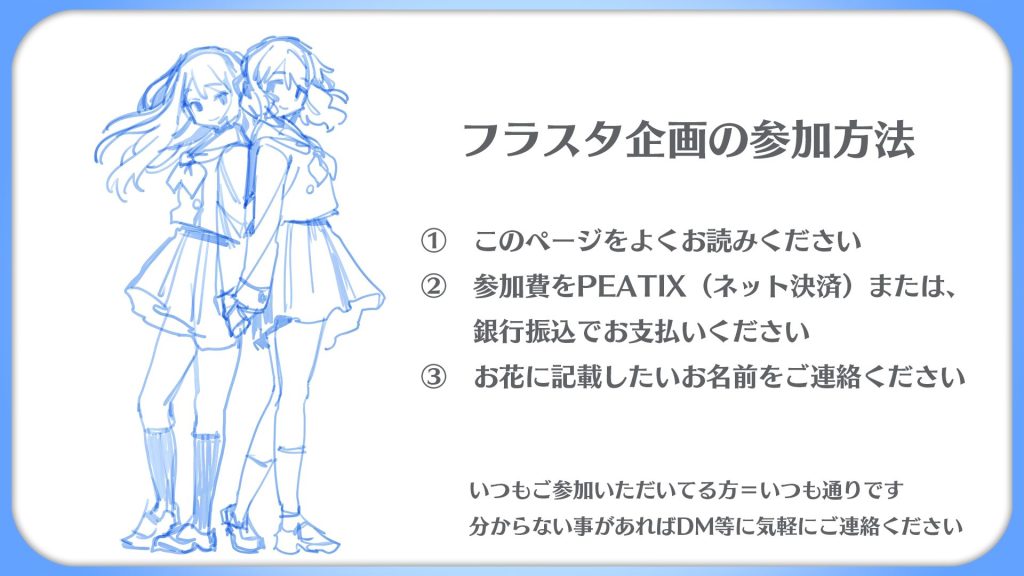 ② こちら側が銀行振込で不安に感じている点としては、銀行振込の方と連絡がとれないことです。ネームボード記載名の取りこぼしなど…起こりそう。銀行振込でご参加いただいた方は『振込名義』と『フラスタ記載名』の2つをどのような方法でもいいので、こちらにご連絡いただけますと幸いです。